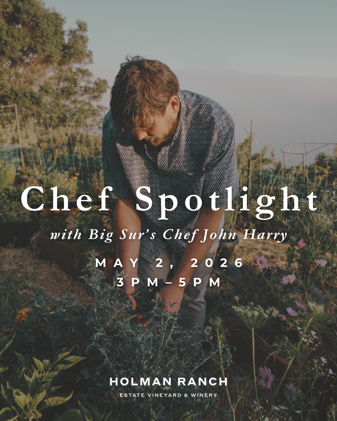 Don't miss our next "Chef Spotlight" with Big Sur's Chef John Harry. Join us for a relaxed afternoon tasting experience featuring seasonal cuisine and estate-grown wines at the Holman Ranch Historic Hacienda.