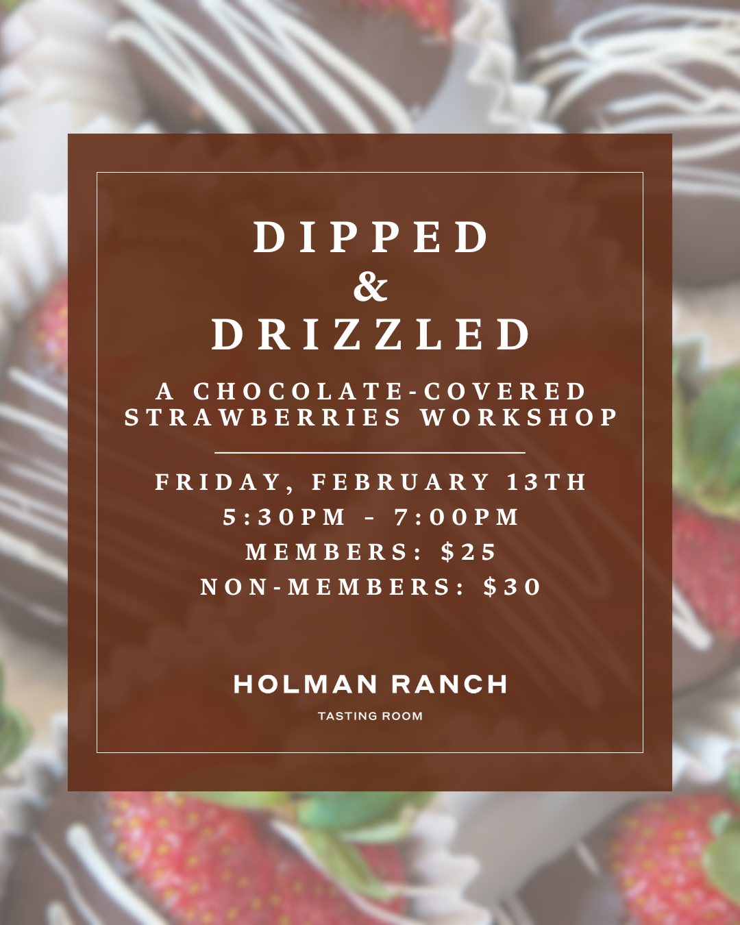 Tickets include one glass of Holman Ranch estate-grown wine to enjoy during the workshop, plus 4 dipped & decorated chocolate-covered strawberries to take home. Additional wine by the glass or bottle may be purchased to enjoy during the workshop.