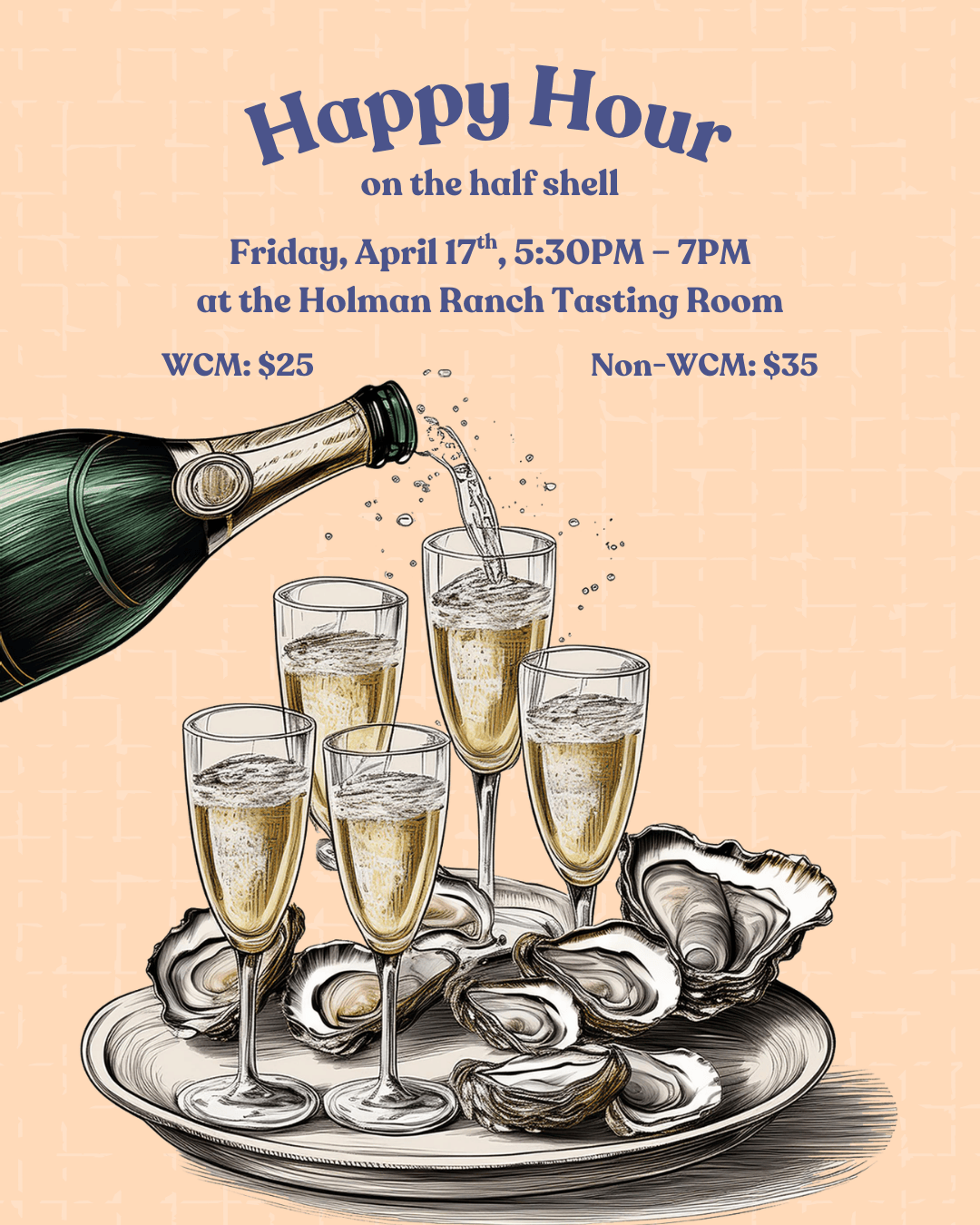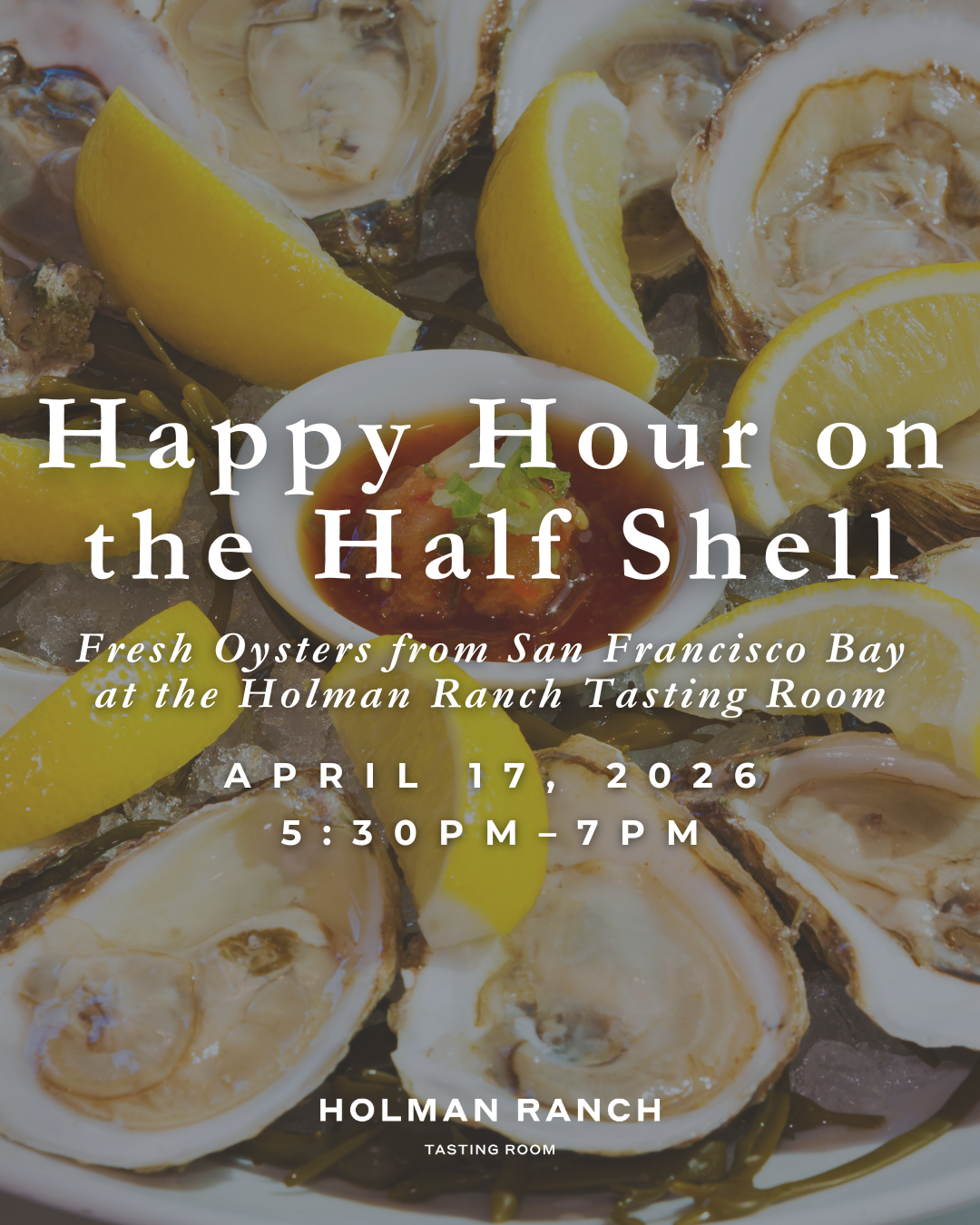 Don't miss Happy Hour on the Half Shell at the Holman Ranch Tasting Room on Friday, April 17th from 5:30PM to 7PM! Join oysterman Parker Stokes as he shucks market-fresh oysters, paired perfectly with our 2021 Reserve Jarman Sparkling Brut Rosé. This wine, with its delicate brioche aroma and lively coastal acidity, enhances every bite.